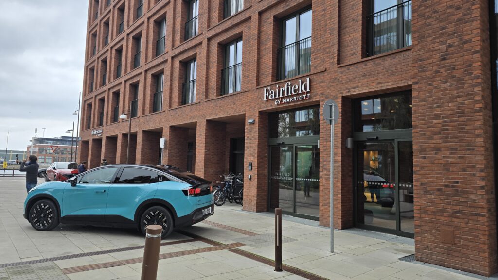 Nissan nama je prijazno omogočil zgodnejšo nastanitev v Fairfield by Marriott, zato sem si lahko privoščila krajši izlet po okolici. Nordhavn na prvi pogled deluje futuristično, a hkrati izjemno človeško. Svetle fasade, steklene površine in čiste linije, prepletene z zelenimi žepi in neokrnjeno obalo. Le nekaj metrov od hotela stoji velika okrogla stavba, kot arhitekturni svetilnik med pristaniškimi toni — vizualno popolna uvodna kulisa v Nissanovo zgodbo o električni prihodnosti. Soseska je oblikovana kot odprti eksperiment: kako združiti urbano življenje, tehnologijo in naravo v harmonično celoto. Moje raziskovanje enega najsodobnejših predelov danske prestolnice je sicer precej kratko, saj me močan veter kaj hitro prežene nazaj med štiri stene.