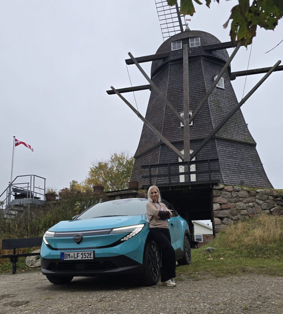Ustaviva se ob tradicionalnem mlinu na veter — drobna simbolika, ki povezuje preteklost in prihodnost energije. Sprehodi mimo danskih lesenih hišk in tišine ravnic ustvarijo občutek, da avto pripada temu prostoru: vetru, svetlobi, minimalizmu.